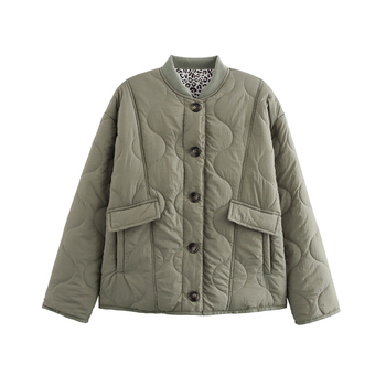 女性用冬秋ジオメトリックキルトジャケットカスタムボタンカジュアルスタンドカラーパッチポケットサーマルライトウェイトジャケット女性用